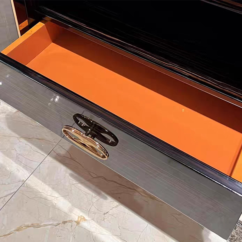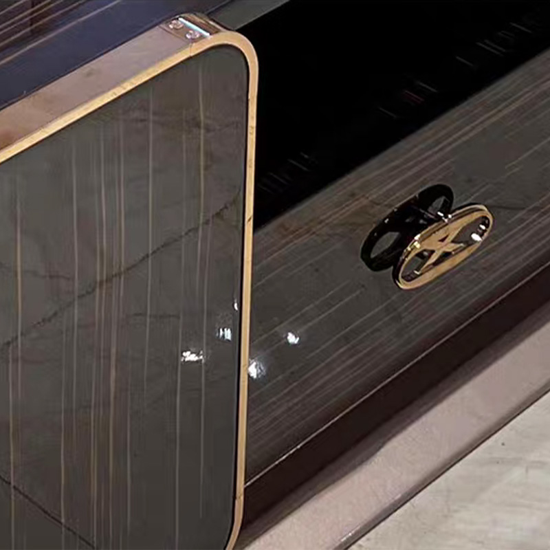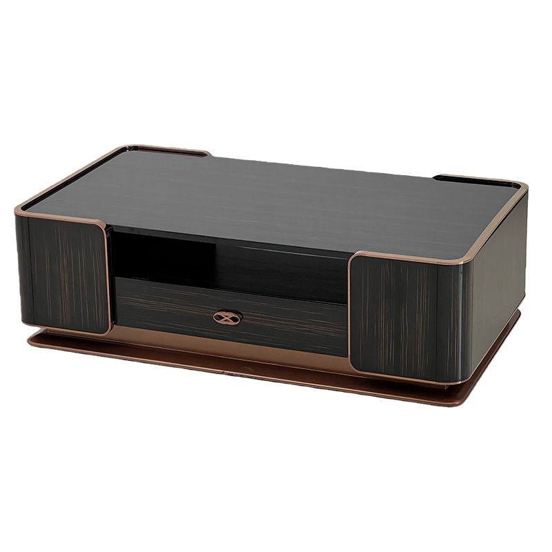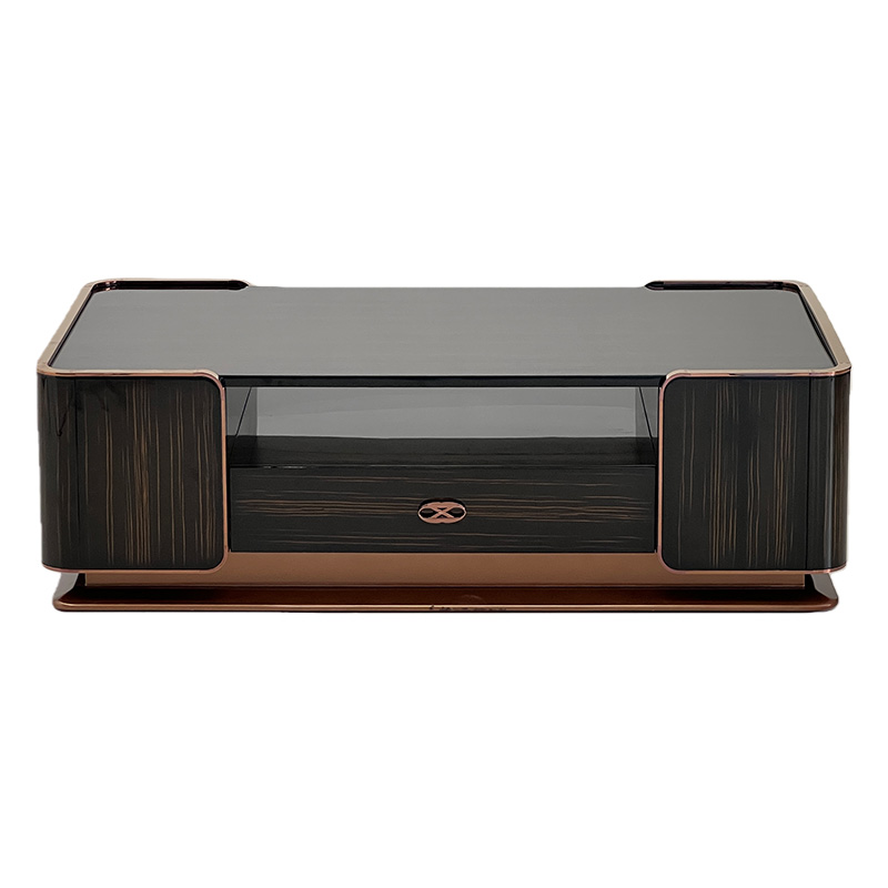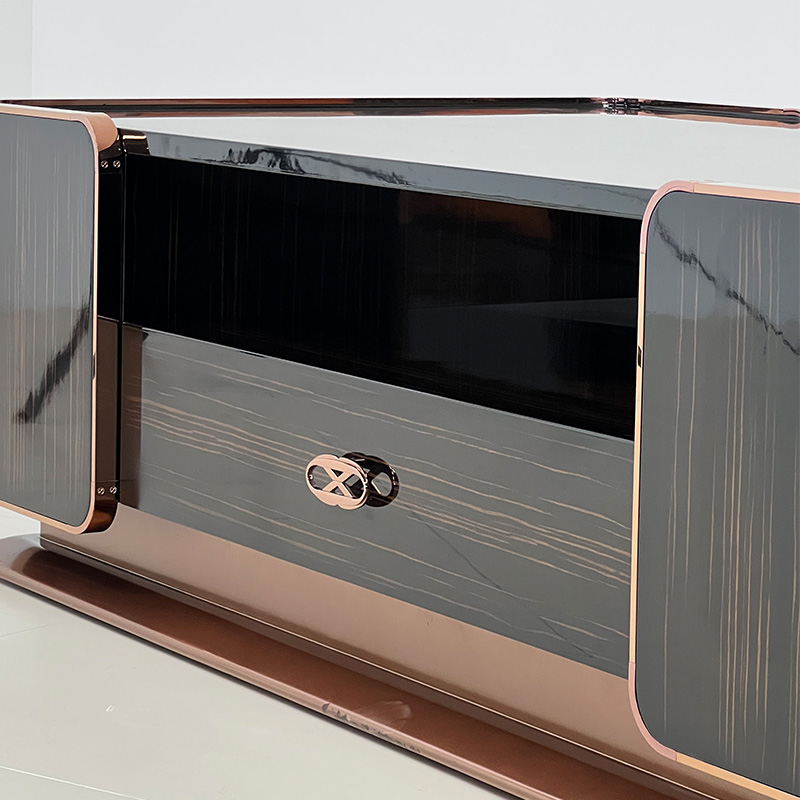 This dark wood luxury media console features a low-profile silhouette that delivers a calm, grounded presence in modern living spaces. The refined wood grain finish is paired with subtle metal trim, creating a balanced dialogue between warmth and contemporary elegance. Soft rounded corners enhance visual flow while adding a sense of safety and comfort to everyday use.
