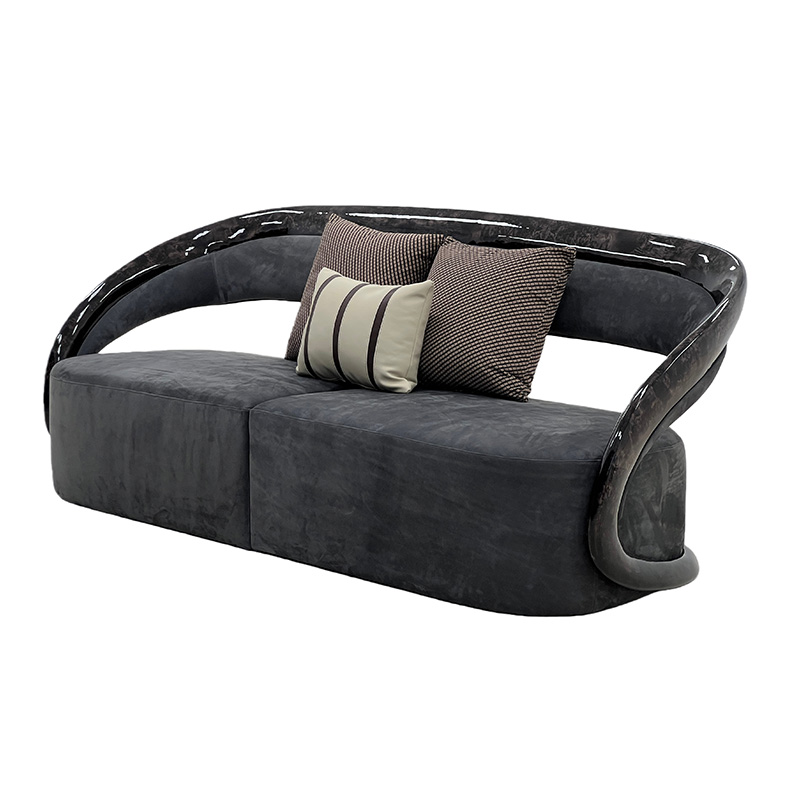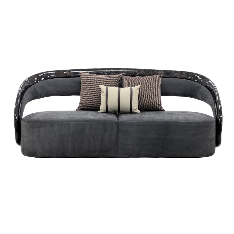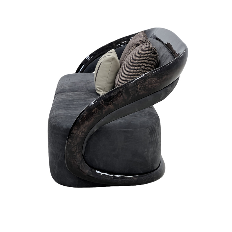 This luxury designer statement sofa is defined by a sculptural wraparound back frame. A high-gloss dark textured outer shell contrasts with soft grey velvet-like upholstery, delivering a refined modern luxury look with strong visual identity. With a generously proportioned seat and layered cushions, it offers both statement-making design and everyday comfort—ideal for villas, penthouses, private clubs, executive lounges and show-flat staging.