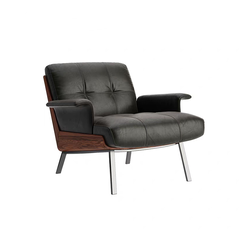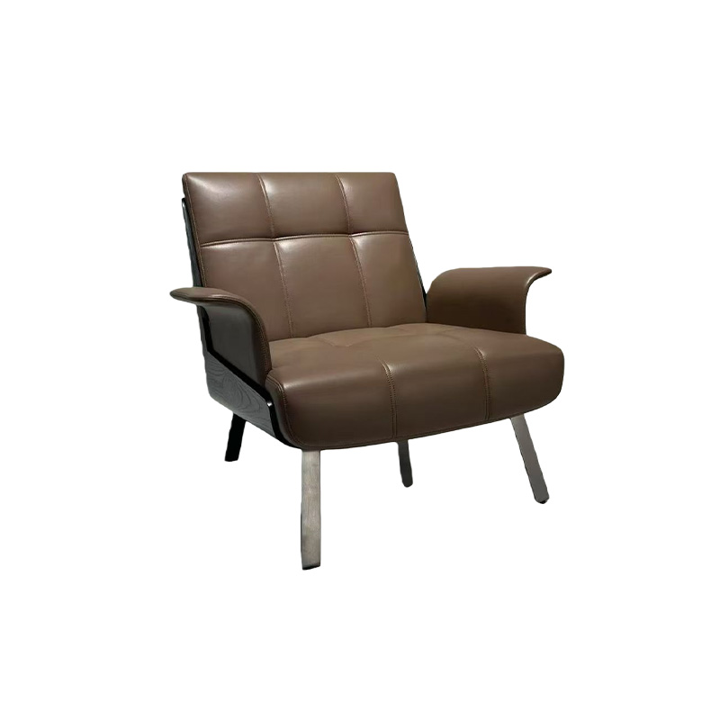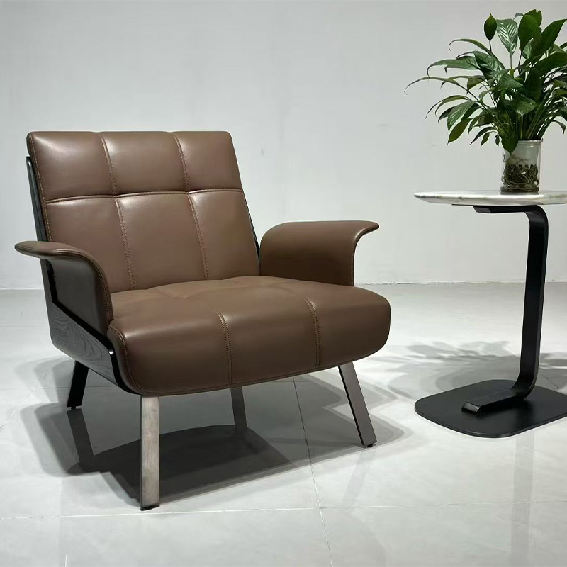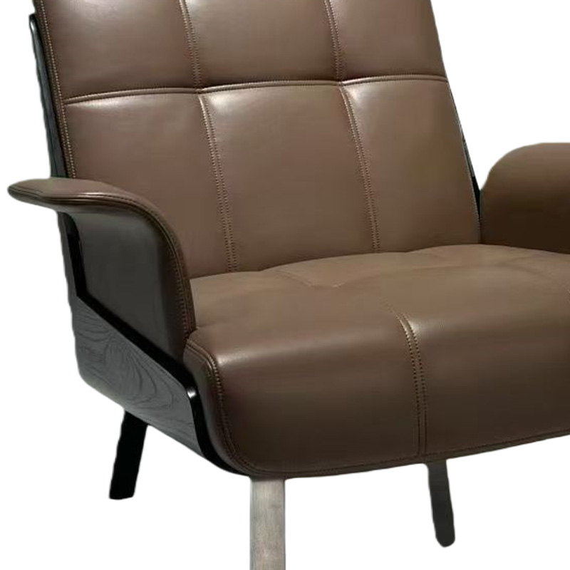 This luxury modern leather lounge armchair is designed with a wide seat and generous sitting depth for a relaxed, premium feel. The warm coffee-brown leather upholstery is refined with clean panel stitching, while the dark wood side panels add an elevated material contrast—perfect for modern luxury interiors. With a gently reclined backrest and curved arms for natural support, it works beautifully as an accent chair in living rooms, reading corners, reception areas, and hospitality lounges, bringing understated sophistication to villas, hotels, clubs, and show-flat staging.
