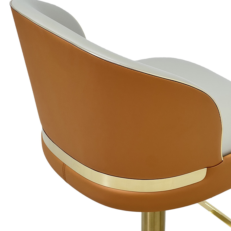 Modern luxury bar stool / counter stool featuring a two-tone upholstered seat, wrap-around backrest and a brushed gold metal pedestal base with integrated footrest. Ideal for home kitchen islands, hotel bars, restaurants and café counters that need a stylish and comfortable commercial-grade bar chair.